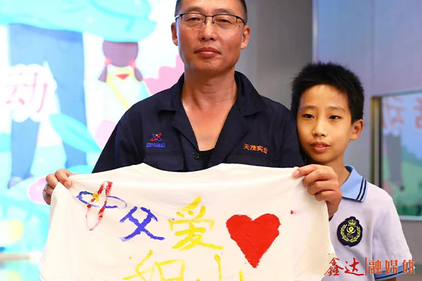 孩子们在爸爸的帮助下开动脑筋,发挥着天马行空的想象力,五彩缤纷的颜料被涂画在纯白的T恤上,一件件充满童趣和满满爱意的“定制版”服装完成了。有的在T恤上画上爸爸的卡通画像,有的写着“我爱爸爸”并画上大大的爱心,有的将爸爸画成了超人的样子……每一件T恤都蕴含着一个有关父爱的温馨故事。